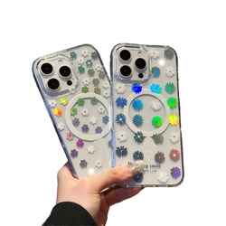 เคสโทรศัพท์แม่เหล็กลายดอกไม้ประดับเลเซอร์แวววาวใสสำหรับ iPhone 16 PRO MAX 13-ฝาหลังชาร์จไร้สายลายหินอ่อน